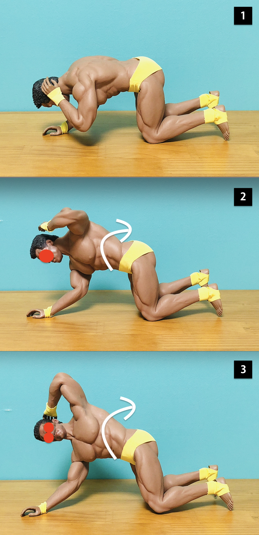 - 무릎을 대고 한손을 바닥에 댄다(한손은 머리뒤에)