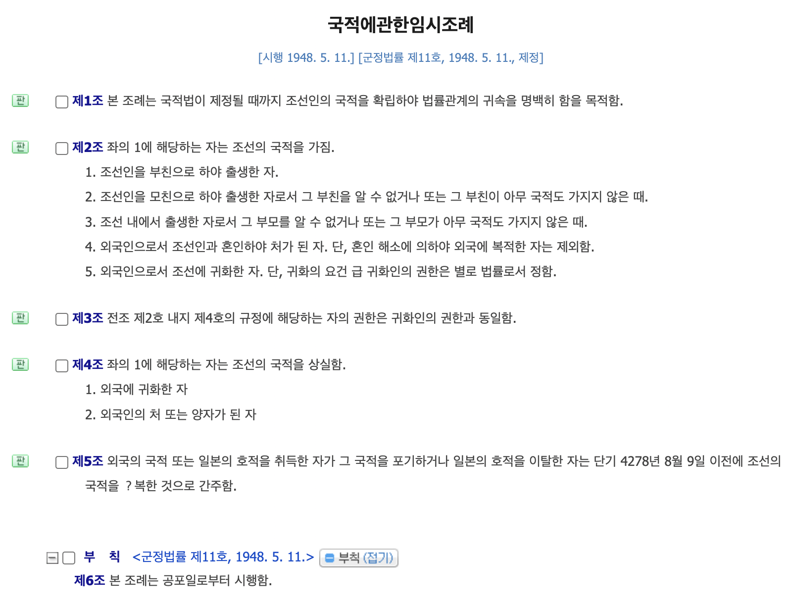 제5조 외국의 국적 또는 일본의 호적을 취득한 자가 그 국적을 포기하거나 일본의 호적을 이탈한 자는 단기 4278년 8월 9일 이전에 조선의 국적을 ?복한 것으로 간주함.