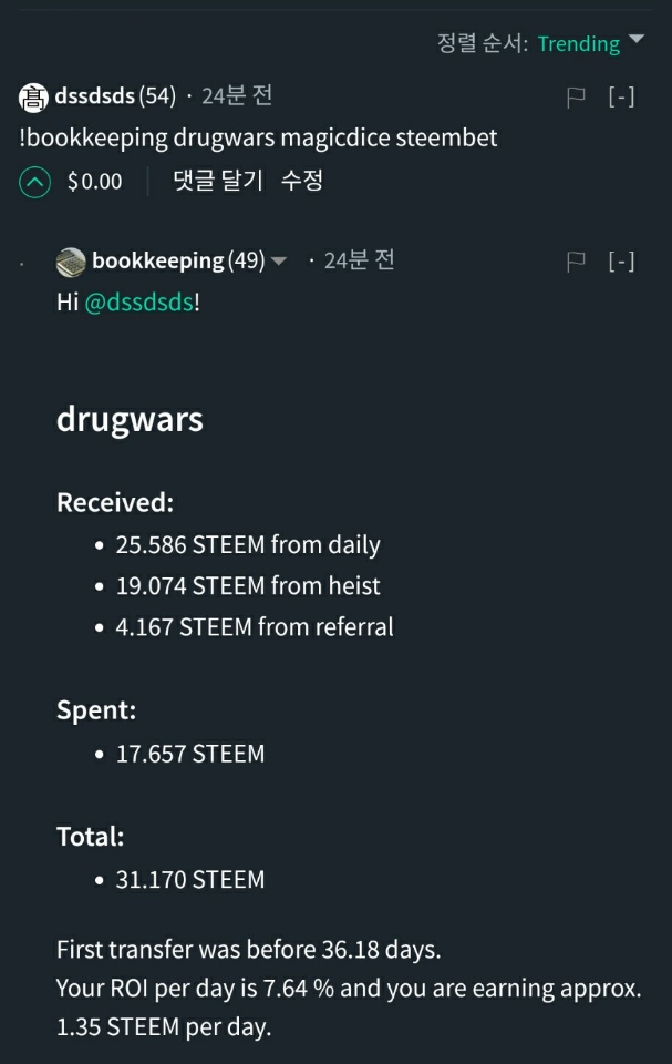 본계정은 17.657 스팀 사용해서 31.17스팀 만들어냈네요
