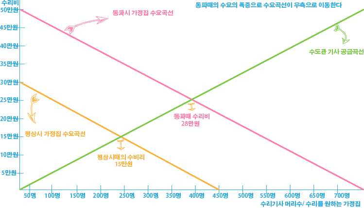 경제의 기초중에 하나: 한정된 물품을 사람들이 나눠쓸때 수요가 공급보다 많아지면 가치가 오른다. 사회주의사회, 공산주의사회, 자본주의 사회, 민주주의사회, 중세시대, 고대로마시대, 어떤 사회이건 상관이 없이 이 원리가 적용이된다. 동파건수가 8배가 증가해서 수리기사에대한 수요가 8배가증가했는데 지금 당장 일하는 수리기사 머리수는 정해져있다면 가격이 오를수밖에없다. 수리기사의 욕심에의해 가격이 오른게 아니라는거다. 가격은 시장이 정해준다. 다른 예를 들면 미국 수퍼볼 중간에 나가는 광고비가 30초에 60억이다. 전세계에서 수퍼볼에서 내보내는 광고를 볼사람들이 10억명이라고한다. 이 많은 사람들이 볼 광고를 내보낼 자리는 몇개로 한정돼 있고 여기에 광고 내보내고싶은 기업들이 엄청나게 많을것이다. 수요(기업)는 엄청나게 많은데 공급(광고시간)은 아주 적다. 따라서 가격이 천정 부지로 올라갈수밖에 없는것이다. 30초에 60억을 받는게 옳으냐 의 문제가 아닌것이다. 또다른 예로 문재인시계를 들어보자. 문재인대통령이 청와대에 초청한사람들에게만 나눠줘서 몇개 존재하지하지않는 기념품 목적의 시계이다. 이 시계의 단가는 4만원 정도. 하지만 경매사이트에서 70만원, 90만원에 팔려고 내놓은 사람이 있었다. 심지어 120만원에 사겠다는 사람도나타났다. 단가보다 20배정도 높은 가격에 팔려는 사람이 사기꾼인가? 단가보다 30배정도 높게 구매하겠다는 사람이 제정신인가? 아니다. 수요(시계살려는사람)보다 공급(시계)이 훨씬 적기때문에 고로 이 시계가 희귀하기때문에 가격이 그만큼 올라간것이다. 문재인 시계는 소량 제작 후 필요할 때 추가 주문하는 것으로 알려졌다. 누가 사기꾼이고 누가 제정신이냐의 문제가 아닌것이다.