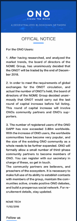 Nome Group 이사회가 시장 동향을 조사하고 분석한 결과, 2018년 12월 말 전에 ONOT이 상장되는 것으로 결정했습니다.