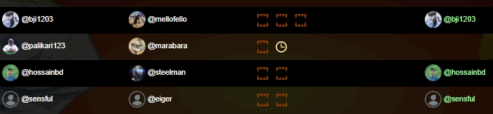 아 오늘 16강은 15스팀인데 날라갔구만 하고 게임을 진행 첫판 당연히 지고 둘째판 당연히 지고, ㅇㅇ 앵 그런데 게임을 또 다시 하더라구요, 왤까 궁금하지만 모르겠다 하고 했는데 이겼네요. 와 저 분을 한 판 이겼다, 하고 기분 좋아했습니다. 게임은 또 진행되고 , 에라 모르겠다 어떤 작전을 선택할까 하고 고민하다. 선택하고 걍 시작하고, 하자마자 결과 눌러 버렸네요. 그런데 제가 이기고 16강 진출... 기분 정말 묘했네요. 게임상에 오류인지 어쨌건 제가 승자로 16강 올라가고, 16강전은 저 보다 랭킹낮은분하고했는데 가까스로 신승해서 8강 행운은 여기까지, @sensful 님이신가 무척 강자이신것 같던데 걍 gg치고 끝나버렸습니다. 그래도 상금 20 스팀 확보 토욜, 오늘 합 50스팀 챙겼네요.