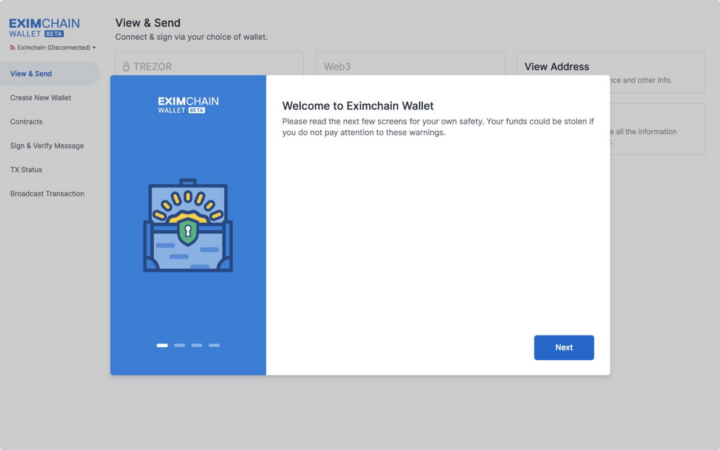 현재 0.1.0버젼의 Eximchain Wallet을 사용해보실 수 있습니다.