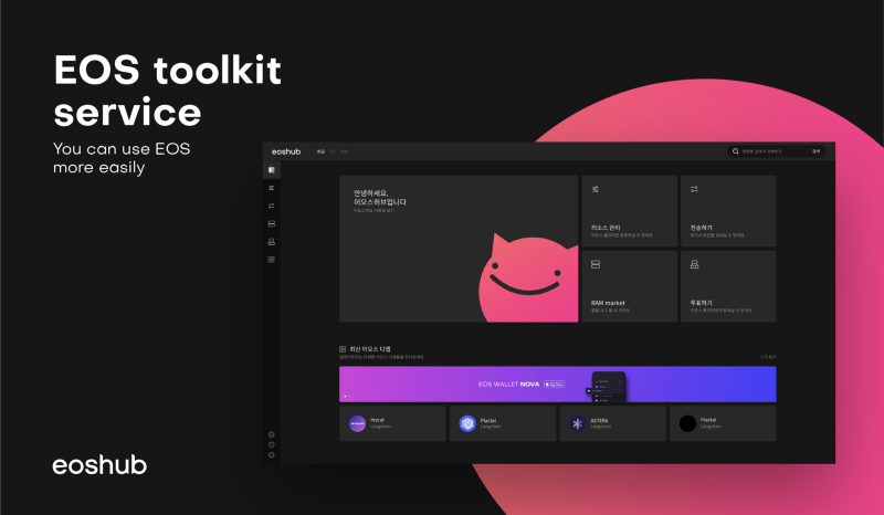 eoshub는 EOS 메인넷의 다양한 기능들을 이용할 수 있는 툴킷 서비스 플랫폼입니다. 기존의 유사 플랫폼들은 개발자 중심으로 구성되었다면 eoshub는 직관적인 UX로 일반 유저들이 쉽고 간편하게 사용할 수 있도록 만들었습니다. 현재 토큰 전송, 투표, 스테이크, RAM 마켓, 계정 검색 조회 등의 기능들을 제공하고 있으며 앞으로 단순 툴킷 서비스가 아닌 차별화된 서비스와 접목시켜 ‘hub(허브)’로의 역할을 강화해 나갈 예정입니다.