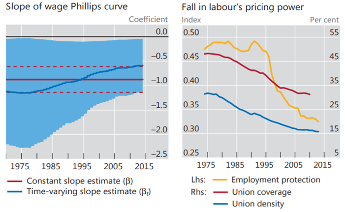 - 비대칭적 효과는 세계화로 인해 노동시장경쟁이 심화되고, 그에 따라 노동자의 교섭력이 약화되며 임금결정력도 저하되는 것이다. 이것은 신흥국보다는 선진국에서 두드러진다는 점에서 비대칭적이다. 이 효과를 직접적으로 실증하는 것은 어렵지만, BIS(2017)에 따르면, 정황을 포착할 수 있는 증거들이 있다. 먼저 아래 좌측 그림은 G7의 선진국의 데이터를 이용하여 임금 필립스곡선 기울기를 추정한 것으로, 1980년대부터 꾸준히 평탄해져온 것을 알 수 있다. 즉 실업이 줄어도 임금 자체가 크게 늘지 않는 상황이 지속된 것이다. 이에 영향을 미칠 수 있는 요인들이 아래 우측 그림의 고용보호와 노동조합의 결속력 약화다. 고용보호와 노동조합 조직률 및 단체협약 적용률 등은 노동자의 영향력을 나타내는 대표적인 지표들인데, 세계화가 진전된 1980년대부터 기조적으로 감소해왔다. 세계화가 노동자의 교섭력을 약화시키고, 이로부터 가격결정력을 저하시켰다면 임금상승이 억제될 수 있다.