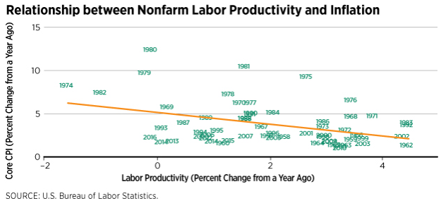 - 전술한 것을 요약해보면 기술진보는 디플레이션의 속성(Productivity Deflation)을 갖는다. 그리고 이는 글로벌 가치사슬의 효과와 매우 유사하다. 즉 기술진보는 경제 내의 생산성을 향상시킴으로써 기존의 제품을 보다 비용효율적으로 생산하게 만들고, 시장 내의 경쟁을 더욱 촉진하여 기업과 노동자의 가격결정력을 감소시킨다. 이 논리에 따라 미국의 노동 생산성과 (석유류 및 식품류를 제외한)근원 물가 간 상관관계를 구해보면, 다음 그림과 같이 분명한 음의 관계가 있음을 알 수 있다.