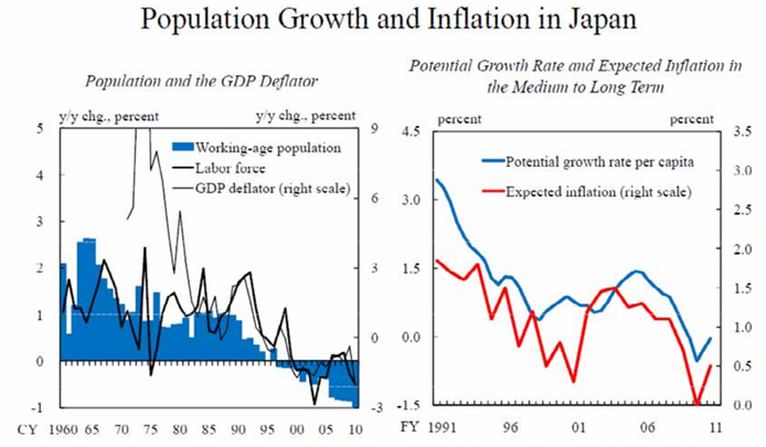 - 인구구조가 인플레이션에 미칠 수 있는 영향은 이론적으로는 논쟁적인 영역이지만, 일본의 인구고령화 경험으로부터 디플레이션이 나타날 수 있다는 우려가 제기되어 왔다.