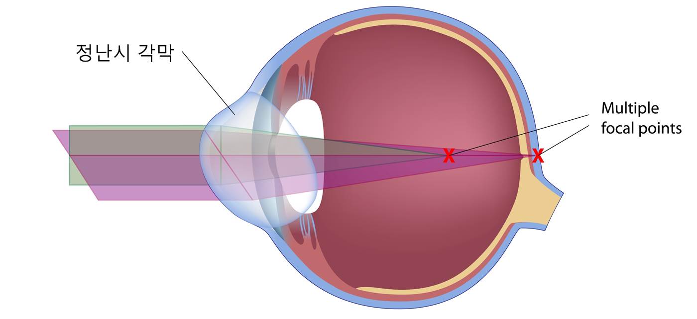 그림에서처럼 이 두 빛 중 하나만 망막에 맺힐 수도 있고, 둘 모두 망막에 정확히 상을 맺지 못할 수도 있습니다. 이건 근시 혹은 원시가 난시와 섞여있기 때문이지요.