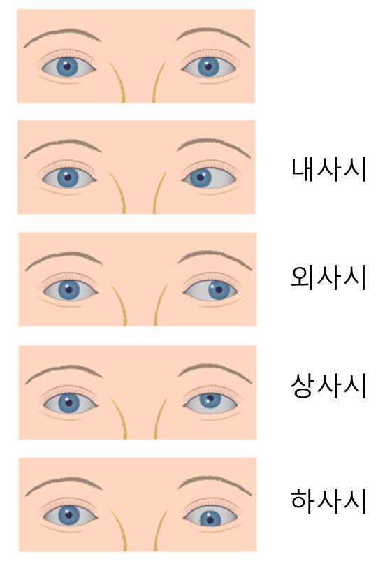 사시는 눈의 방향에 따라 이름을 붙입니다. 아래 사진에서처럼 눈이 안쪽으로 몰려있는 경우내사시, 바깥쪽으로 나간 경우는 외사시, 위로 올라가면 상사시, 아래로 내려가면 하사시라고 부릅니다. 이렇게 두 눈이 서로 다른 곳을 보게 되면 어떤 문제가 생길까요?