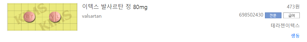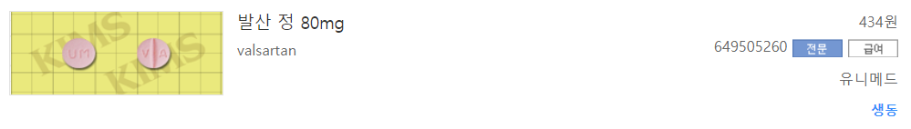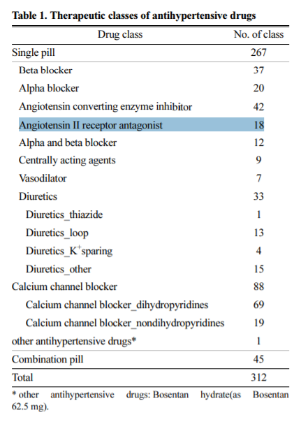 2009년의 논문에 따르면 한국에 총 267개의 혈압약 성분이 있습니다. 복합제까지 312개 입니다. 이 중의 한 성분인 발사르탄(valsaltan)은 색칠이 된 '안지오텐신 2 리셉터 안타고니스트' 18개 중의 1가지 입니다. (출처: 고혈압 환자의 혈압강하제 처방양상. 성예나 외. 한국임상약학회지 제19권 제2호. Kor. J. Clin. Pharm., Vol. 19, No. 2. 2009)