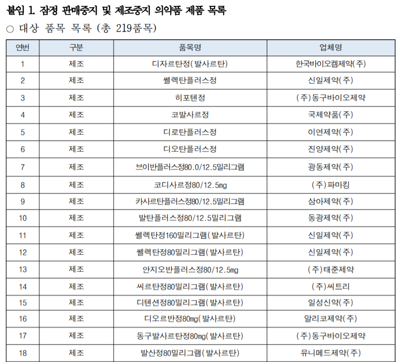 식약처에서 219개의 약에 대해 판매중지를 하였습니다. 목록은 아래에 첨부하였습니다.