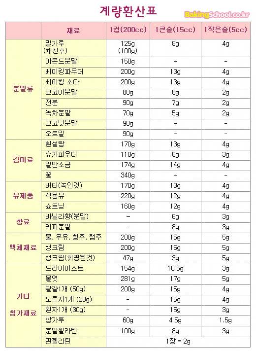 홈베이킹환산표fertilestar (43)in #kr • 8 years ago 홈베이킹시 저울없이도 유용한 계량환산표입니다. 처음 베이킹을 시작할 때 도움이되었던 자료라 올려봅니다. 출처 베이킹스쿨 #food
