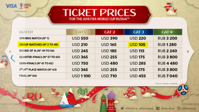 먼저 FIFA에서 판매하는 공식 가격표입니다. 조별예선 3등석이 105 USD입니다. (많은 사람들이 월드컵 티켓은 엄청 비싼줄 아는데, 생각처럼 얼토당토 않게 비싸지는 않습니다. 참고로 국내 A매치의 3등석 가격이 3만원 정도 합니다.