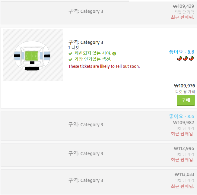 Viagogo 판매 가격도 FIFA 사이트와 큰 차이는 없습니다. 대략 액면가에 판매되는 티켓들이 아직 있고, 좀 더 높은 가격도 보이지만 대략 액면가의 2배 이내에서 거래되는 듯합니다. (스웨덴전, 3등석 기준 108,000원~ 200,000원)