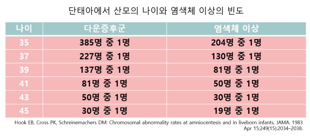 만삭 때 35세인 경우 나이만 고려하였을 때 1/385 정도의 빈도로 다운증후군이 발생합니다. 그 외 다른 염색체 질환까지 포함하면 204명 중에 1명꼴로 발생하는 것으로 알려져 있습니다. 이는 0.25~0.5%의 빈도입니다. 한편, 45세 산모의 경우에는 1:19~30 정도의 빈도입니다. 대략 3~5% 정도로 생각할 수 있겠습니다.