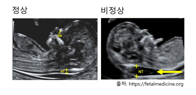 - 목덜미 투명대가 늘어나게 되면 (3mm이상) 추가적인 검사 및 염색체 검사를 권유.