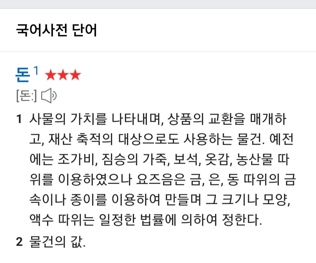 오늘 밋업 중 '돈이란 무엇일까?'하는 이야기를 잠시 나눴다. 너무나도 익숙한 단어인데 막상 '돈'에 대한 정의를 명료하게 내리기가 어려웠다. 그래서 '돈'의 사전적 정의에 대해 알아보았다.