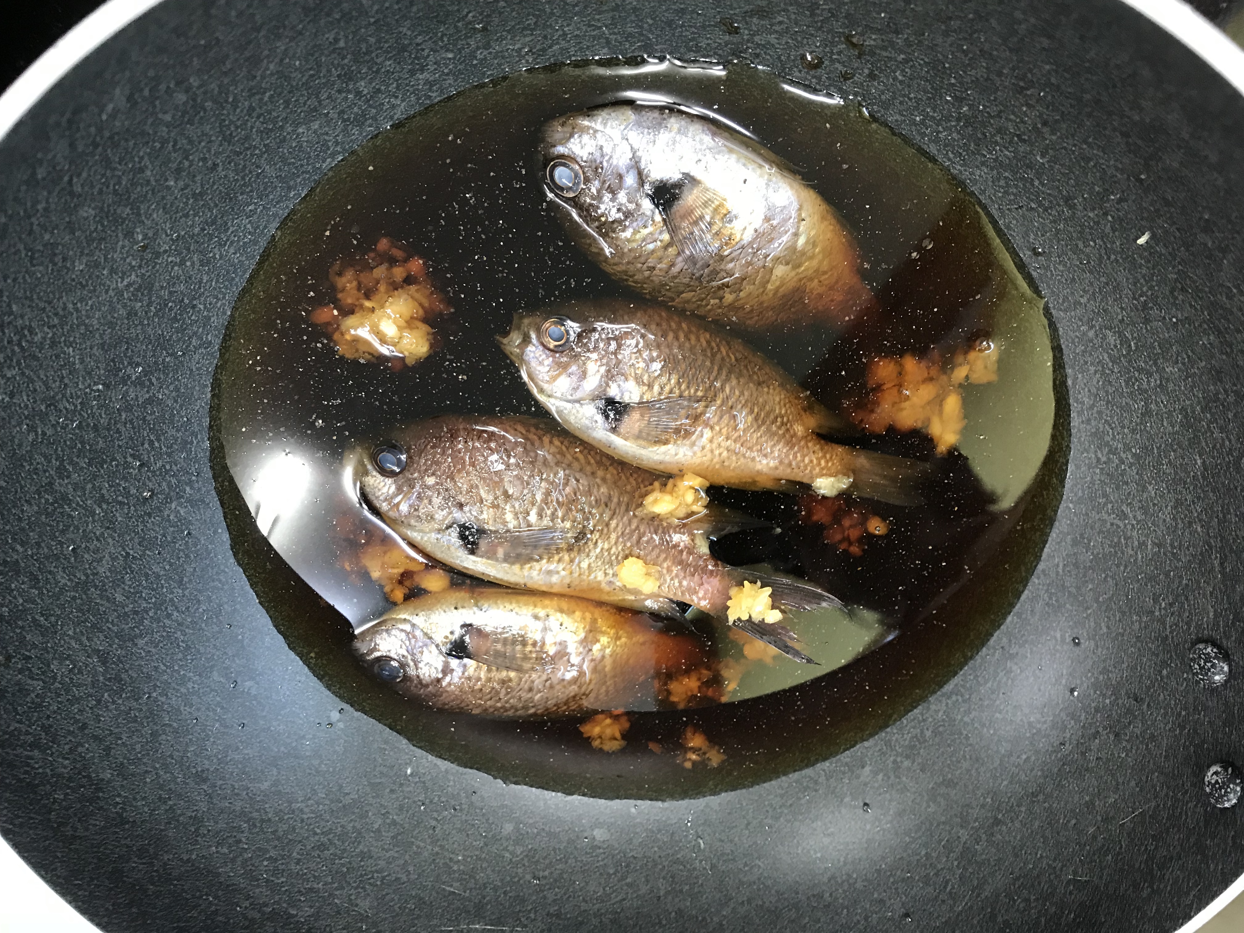 반쯤 국물이 졸면 식용유를 넣고 비늘이 거의 바닥에 붙어서 탈 때까지 바짝 조린다.