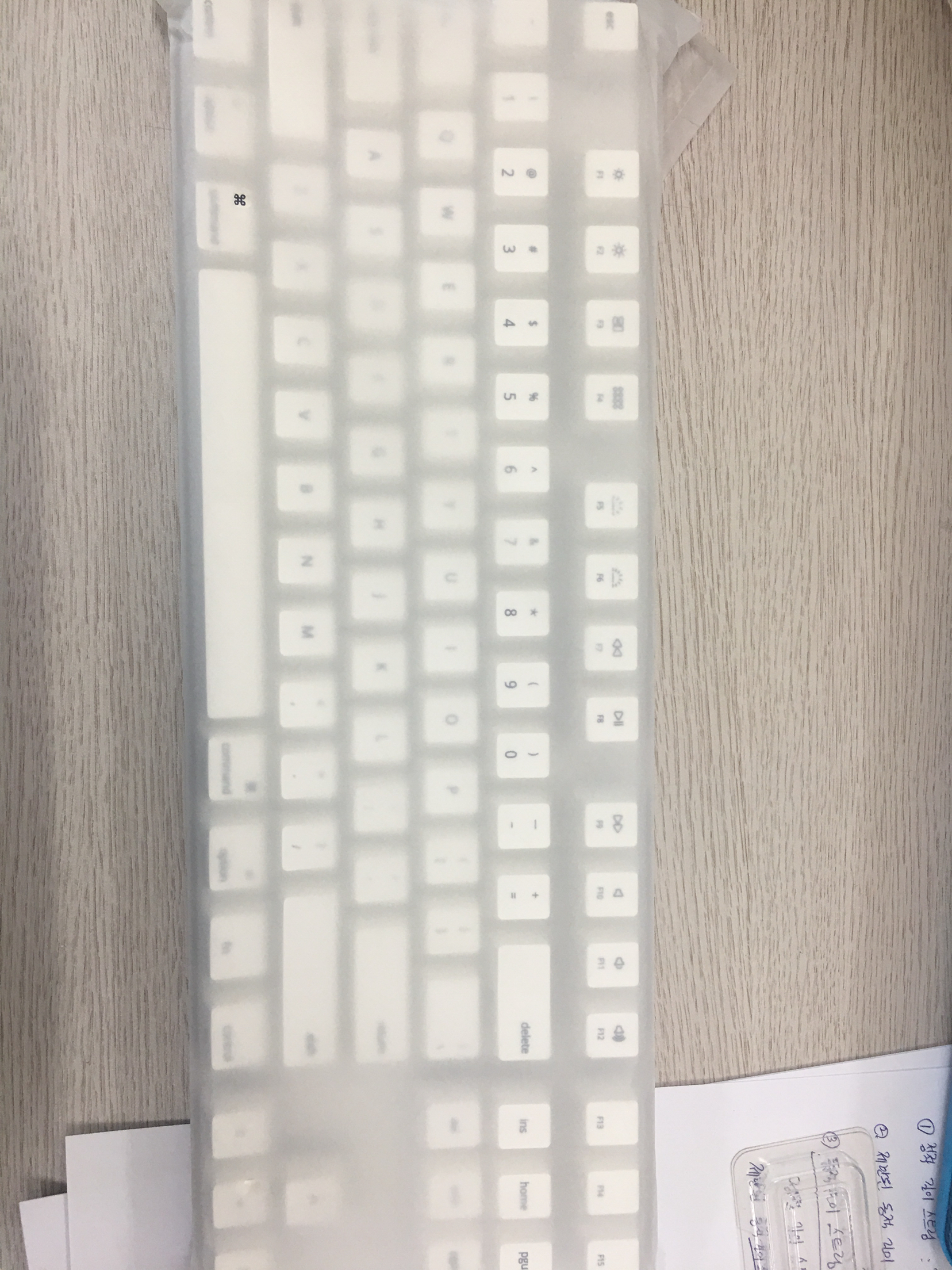 키보드 덮개가 하나 오는데 얇은 합성소재 재질로 되어있습니다.