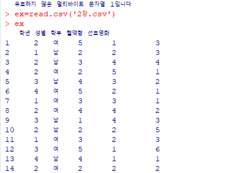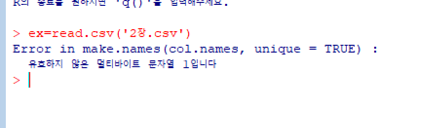 그리고 r언어에서 저 파일을 불러 오면 유효하지 않은 멀티바이트 문자열 1입니다.