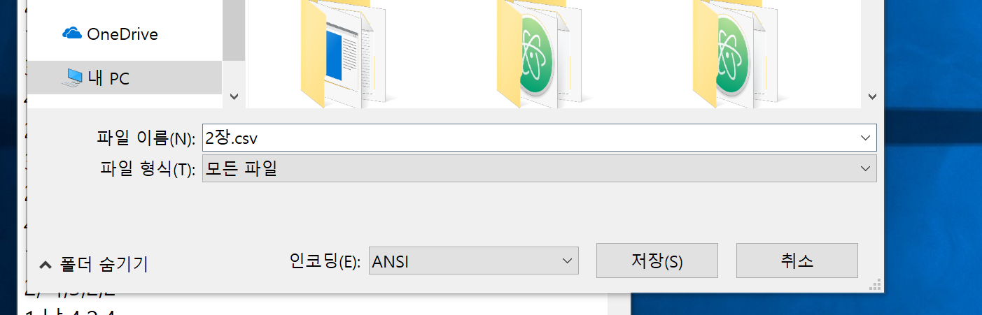 그리고 파일이름은 원하는이름.csv로 두고 밑에 인코딩 부분을 ANSI 로 바꾸어 줍니다.