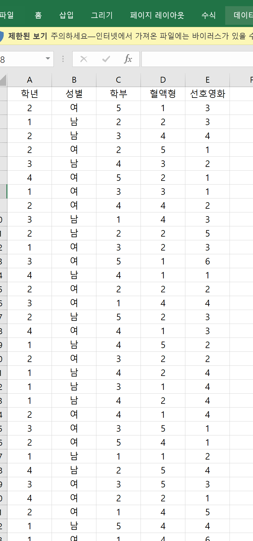 먼저 위와 같은 엑셀 파일을 r언어에서 읽어오기 위해서는 엑셀 내부에서 csv 파일로 바꾸어야 해요.