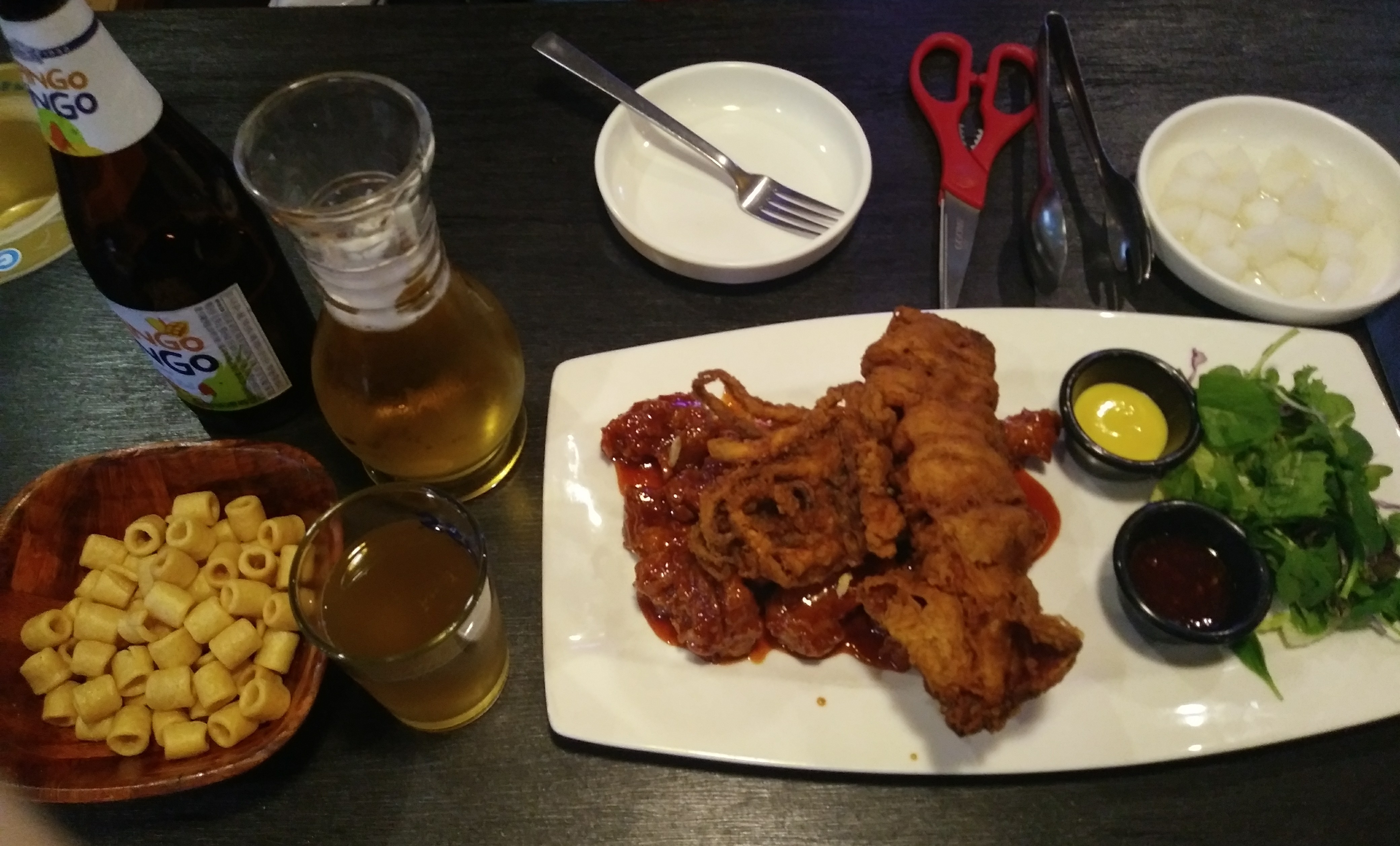 근처 주점에서 맥주 한 잔도 했습니다. 맥주와 함께 먹은 양념치킨과 오징어 튀김도 정말 맛이 좋았습니다.