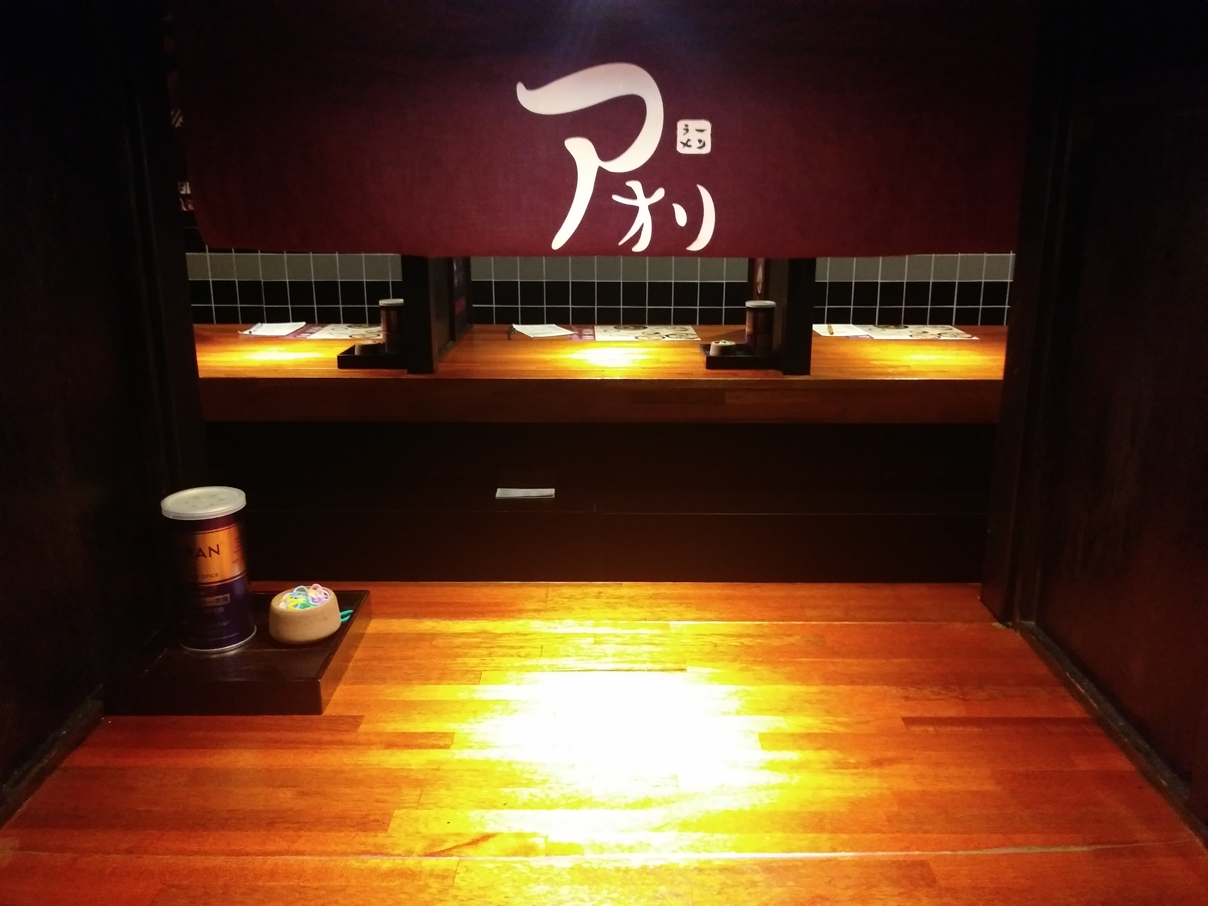 제가 주문한 아오리라멘과 1인용 자리의 모습입니다. 저는 매운맛 정도를 기본으로, 친구는 얼큰한 맛으로 주문하였는데, 쓰여 있는 그대로 살짝 매콤한 정도의 차이만 있을 뿐 둘 다 맛이 좋았습니다.