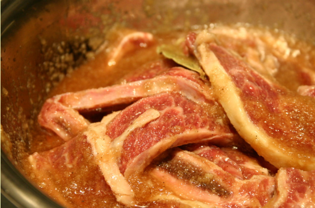핏물 뺀 갈비에다 들이 붓습니다. 여기에 월계수잎을 서너장 같이 넣어줍니다.