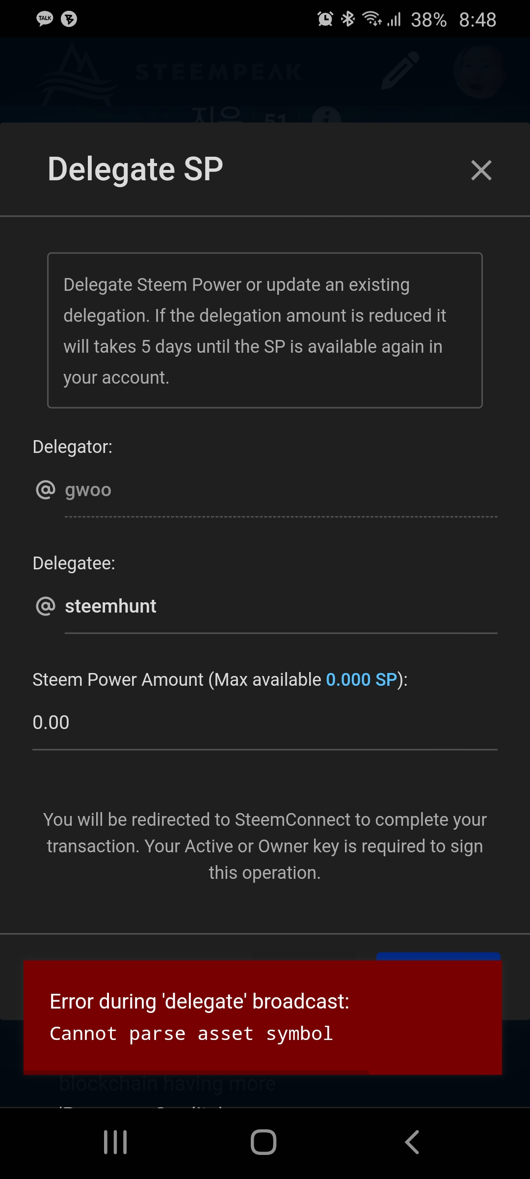스팀헌트에 위임한 스파 회수 불가gwoo (51)in #kr • 6 years ago 스팀헌트 보상도 없고해서 임대한 스파를 회수하려고 하는데 에러만 계속 뜨네요. 혹시 저와 같은 문제를 겪으신 분들 있으면 어떻게 해야할지 알려주시기 바래요~~ #steemhunt #delegation