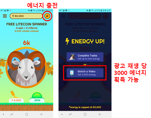 어플을 켜놓으면 조금씩 에너지가 차지만 계속 돌리다 보면 에너지가 부족하게 됩니다. 이 경우에는 에너지 충전 기능을 사용하시면 됩니다. 광고 재생 당 3000 에너지 획득이 가능합니다.지갑으로 전송
