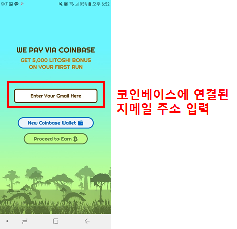 맨 처음 어플을 실행할 때 보이는 화면입니다. 코인베이스에 연결된 지메일 주소를 입력하거나, 없으시면 코인베이스 가입을 하시면 됩니다. 로그인 성공 시 광고가 많이 나올거라고 미리 경고를 합니다. 정말 많이 나와요 :-)뽑기