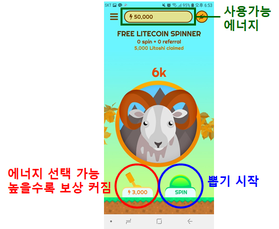 인터페이스는 매우 간단합니다. 맨 위에 사용가능한 에너지가 나옵니다. 이 에너지를 3000이나 5000 (선택가능) 투자하여 라이트코인 뽑기 게임을 할 수 있습니다. 광고시청이나 설문조사 진행 후 획득한 라이트코인이 표시됩니다.에너지 충전