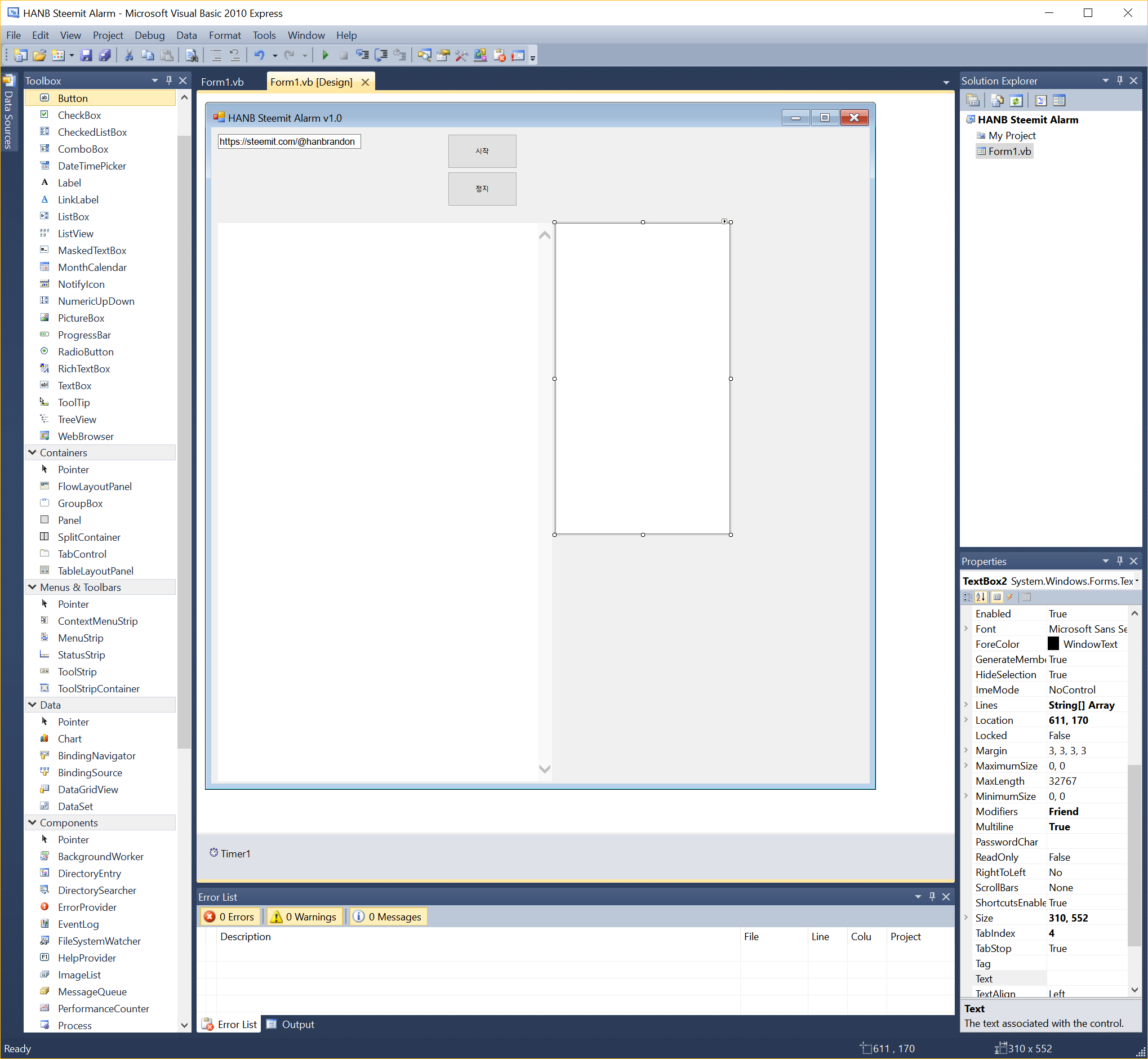 이렇게 링크를 넣을 텍스트 박스와, 타이머, 웹브라우져, 소스코드 불러와 테스트할 텍스트박스를 임시로 넣었습니다.