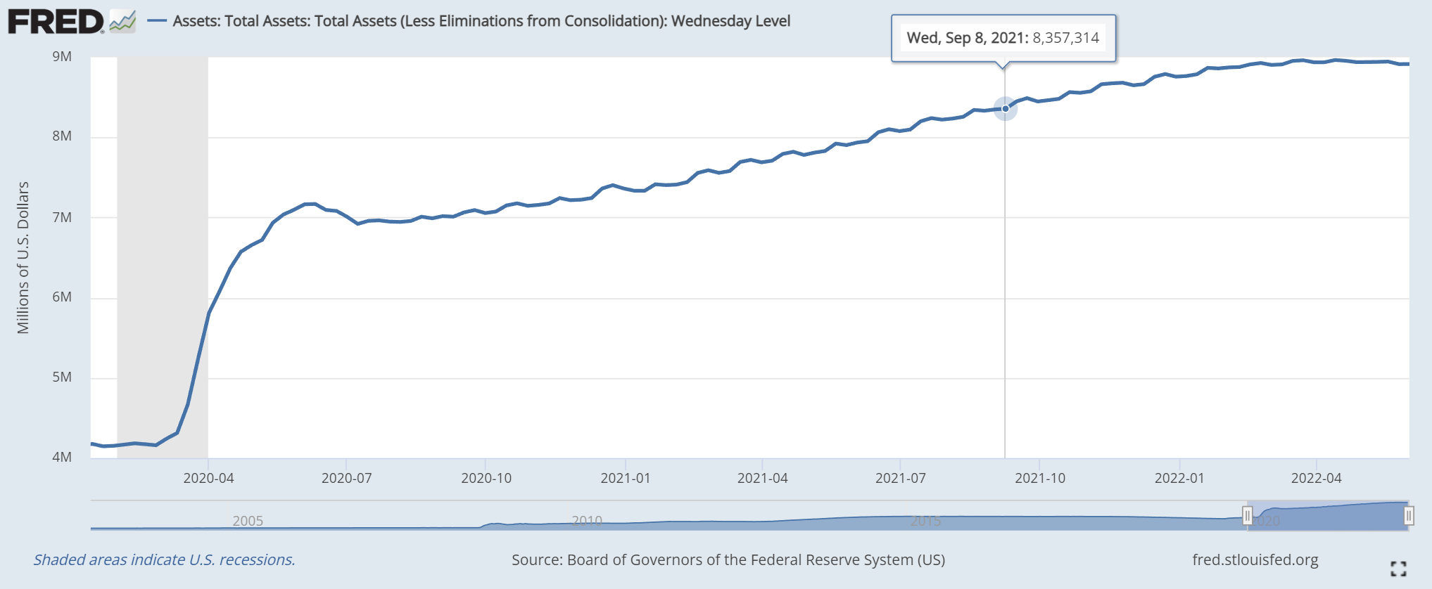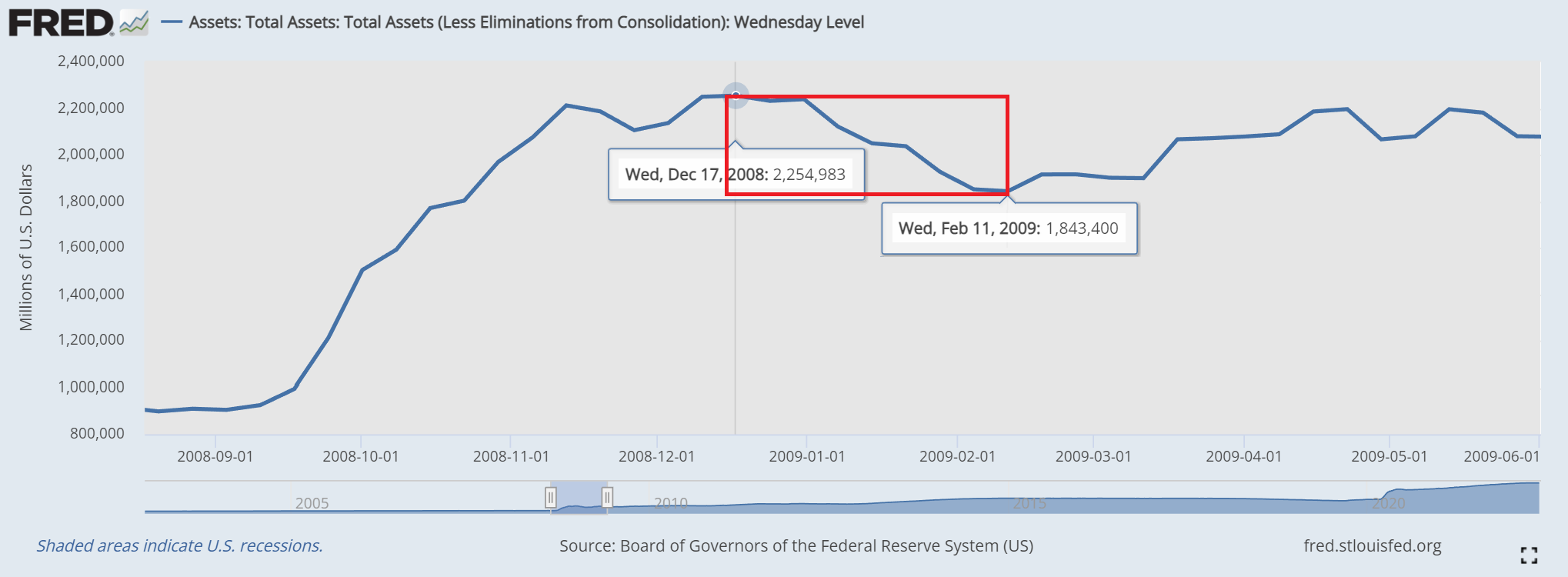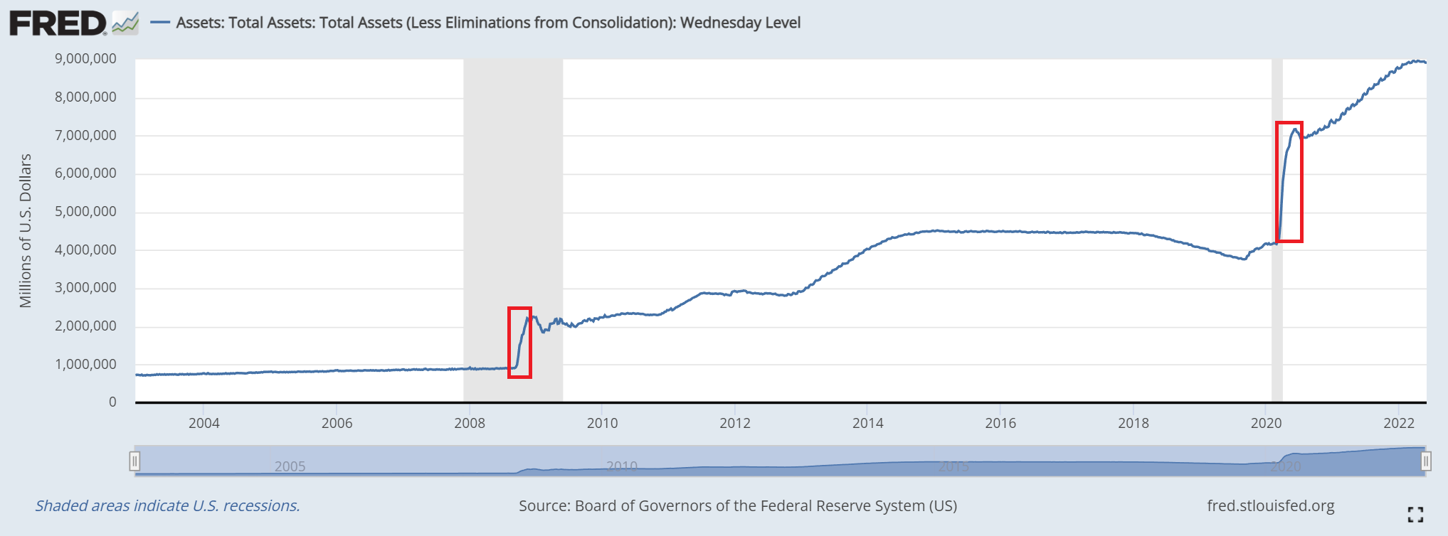 지난 20년 동안 크게 2번의 경제 위기가 있었고, 2008년 서브프라임 모기지(Subprime mortgage) 사태에 미국은 통화량을 급격히 늘리며, 경제 위기를 극복하였다. 2020년 코로나 바이러스로 인해 경제 위기가 찾아왔고, 미 연준은 이번 경제 위기도 양적 완화로 경제 위기를 극복하고자 하였다. 이는 위 그래프에서 빨간 영역으로 표시한 부분을 통해 알 수 있다.