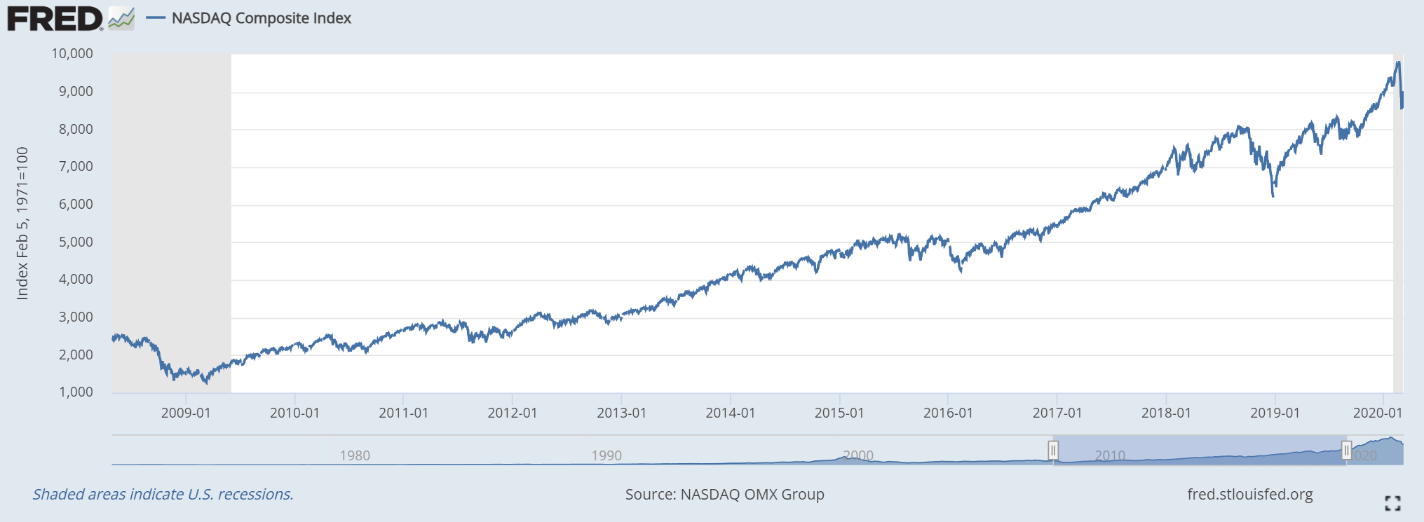 코로나가 터지기 전까지 약 10년 동안 나스닥 지수는 10배 가까이 상승하였다. 여기서 우리는 장기적이고 거시적인 관점에서 코인 시장이 앞으로 어떻게 흘러갈 지 어느 정도 예상해볼 수 있지 않을까?