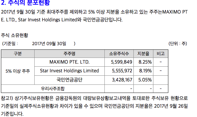 (1) 공시 내용을 토대로 보면 2017년 09월 30일 기준, 국민연금공단이 5.05% 지분을 보유 상태