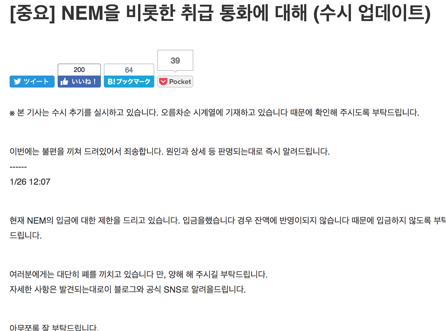 일본 가상통화 거래소Coincheck의 출금이 모두 정지됐고 현재 NEM의 모든 매매가 정지 되었다는 소식입니다.