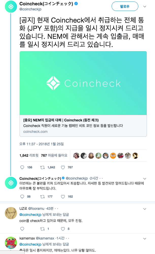 공식 트위터에도 공지가 올라온 상태군요. https://twitter.com/coincheckjp