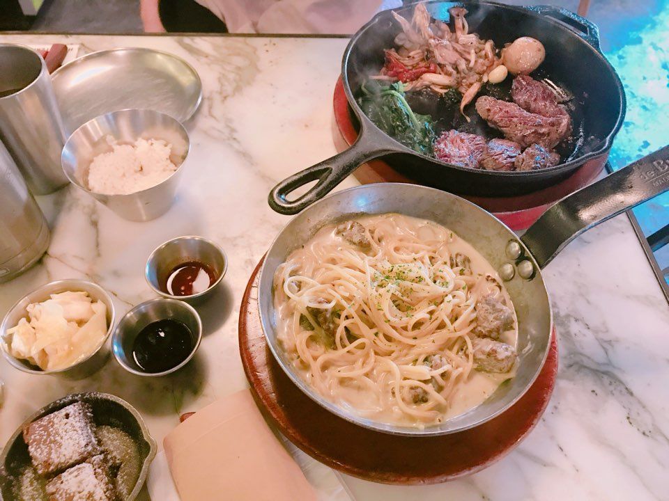 저는 가장 많이 찾는다는 2046 팬 스테이크를, 친구는 크림 미트 파스타를 시켰답니다.