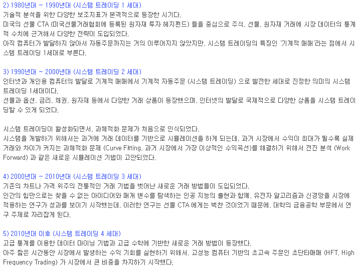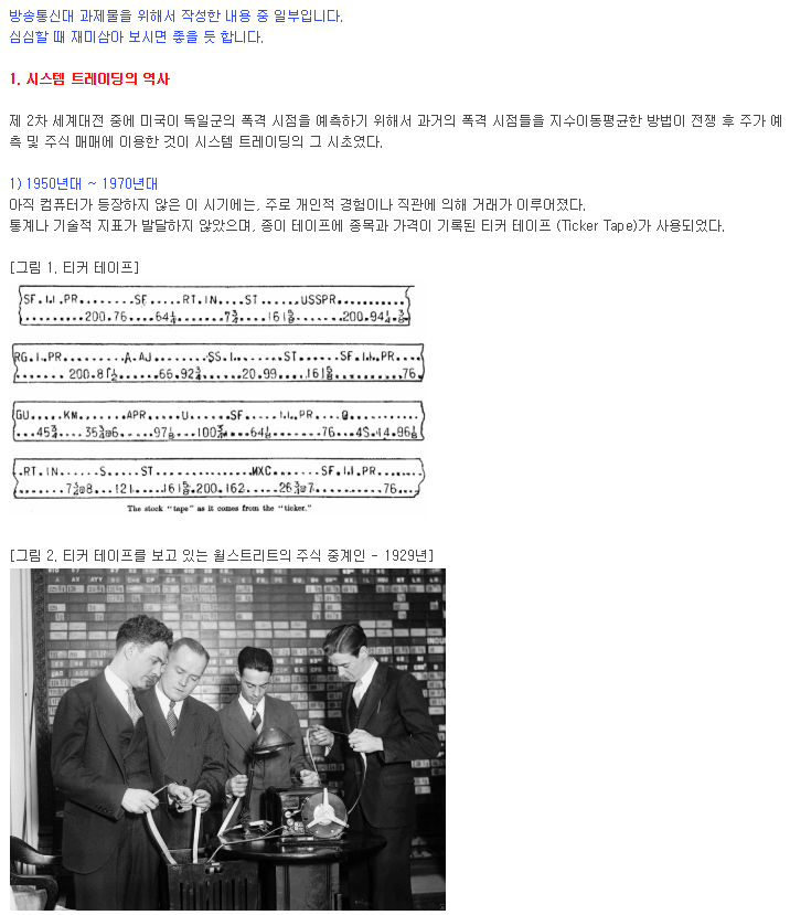 인간의 심리를 배제한체 정해진 규칙대로 컴퓨터를 이용해 기계적으로 매매 하는 것을 시스템 트레이딩이라 합니다. 10년 이상 같이 일해온 회사 동료분 께서 시스템 트레이딩의 역사에 관한 글을 정리한게 있어 소개 합니다.