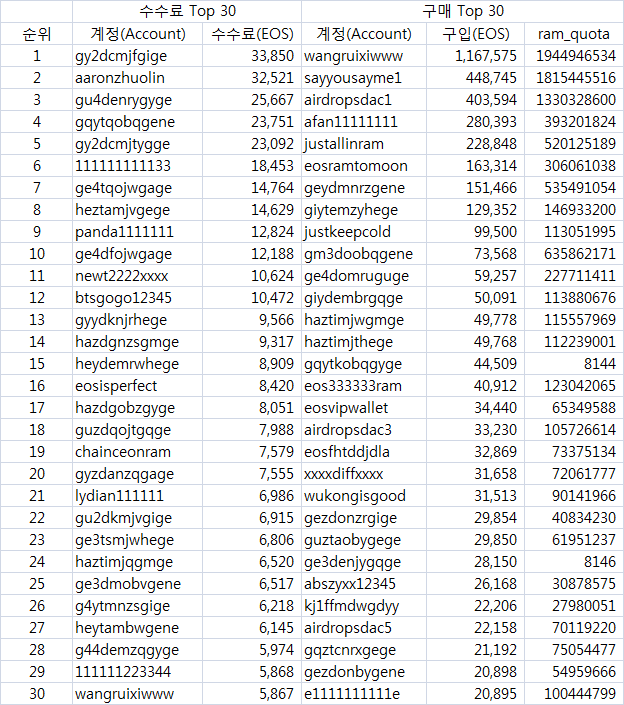 구매 Top 30는 구입 계정으로 판매 기록이 없는 계정 기준 입니다.
