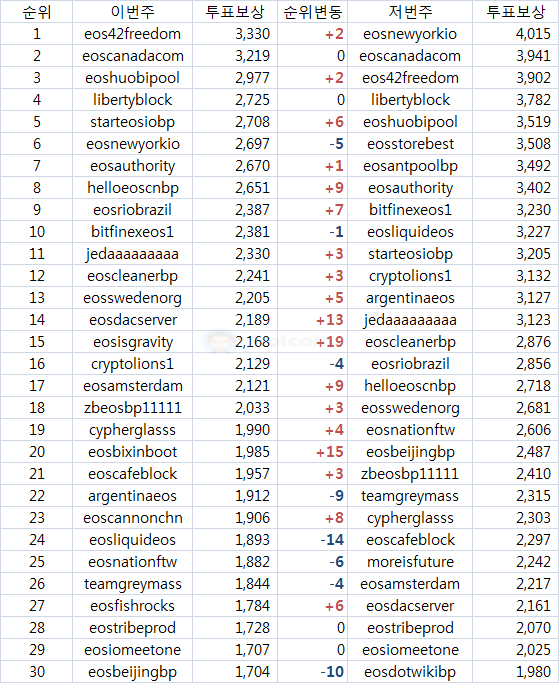 한국 BP 이번주 순위는 eosnodeonebp(42),eoseouldotio(43), eosyskoreabp(45) 입니다.