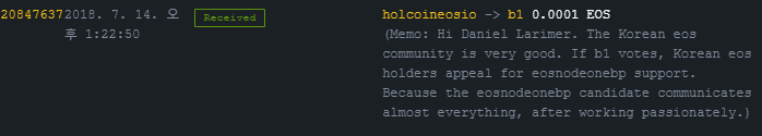 b1 이 투표권을 행사한다고 해서 샘플로 한국 bp 중 eosnodeonebp 가 열정적으로 일하며 모든것을 홀더들과 소통하는 bp 이니 지지를 호소한다는 메모를 보내 봤습니다.(한국 bp 모두들 지지합니다.)