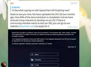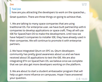 - 우리는 전통적인 OS를 사용하는 많은 우주 회사들과 이야기하고 있습니다. 엔터프라이즈 사용자를 위해 우리는 6 개 회사와 파트너십을 맺어 응용 프로그램이나 우주선을 개발했습니다. 그들은 모두 SpaceChain OS 용 IDE를 사용하여 개발합니다. 지금까지 우리는 IDE를 설치하는 3 개 회사를 도왔습니다. 그들은 이미 그들의 회사에서 사용했습니다. 우리는 엔터프라이즈 파트너와 함께 계속 홍보 할 것입니다.