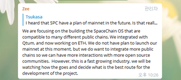 우리는 많은 공공 체인과 호환되는 SpaceChain OS 구축에 주력하고 있습니다. 우리는 Qtum과 통합되어 현재 ETH에서 일하고 있습니다. 현재로서는 메인 넷을 시작할 계획이 없지만 더 많은 공용 체인을 통합하여보다 많은 오픈 소스 커뮤니티와 더 많은 상호 작용을 할 수 있습니다. 그러나 이것은 빠르게 성장하는 산업으로 우리는 어떻게 진행되는지 지켜보고 프로젝트 개발을위한 최적의 경로를 결정할 것입니다