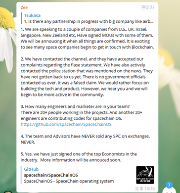 프로젝트에 20 명이 넘는 사람들이 일하고 있습니다. 또 다른 20 명 이상의 엔지니어가 우주선 OS에 대한 코드를 제공하고 있습니다. https://github.com/spacechain/SpaceChainOS팀과 고문은 교환에서 SPC를 절대로 판매하지 않았다.