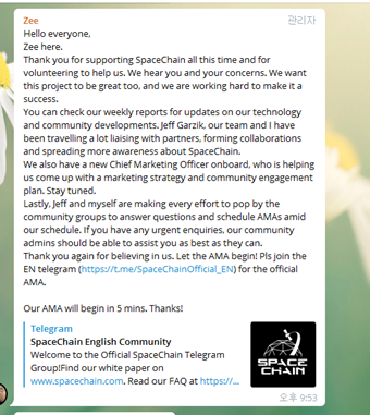 우리를 믿어 주셔서 다시 한 번 감사드립니다. AMA 시작하자! Pls는 공식 AMA를 위해 EN 전문 (https://t.me/SpaceChainOfficial_EN)에 가입합니다.