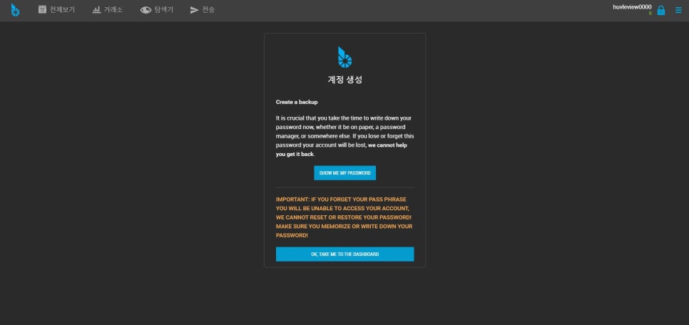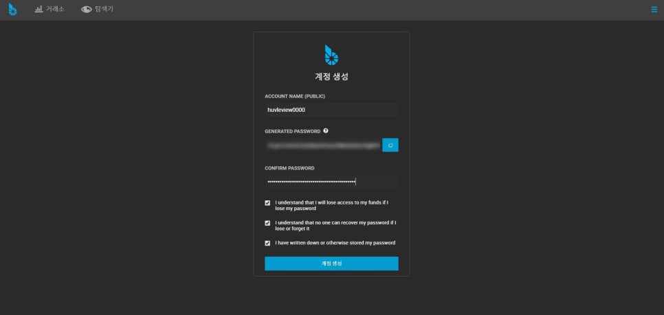 비밀 번호를 기억하거나 적도록 하세요! 비밀번호로 계정 로그인할 수 없는 경우, 비밀번호를 재설정하거나 복원할 수 없기 때문에 주의하라는 경고 문구가 주황색으로 표기되어 있습니다. 이것은 스팀잇 사이트와 비슷하게 운영되고 있습니다. 잊어버릴 경우 계정을 버려야 하기 때문에 꼭 나만 알 수 있는 곳에 붙여넣기를 해 줍니다.