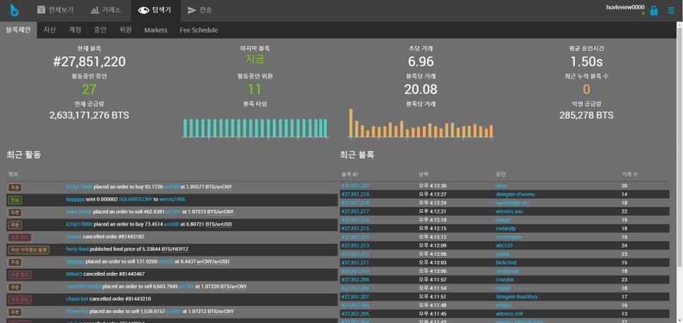 평균 거래량 및 마지막 블록체인 거래가 언제 이루어졌는지, 현재 공급되고 있는 비트쉐어(BTS) 코인은 몇 개인지, 현재 활동 중인 증인 등의 정보를 알 수 있었습니다. 계속해서 주문하고 주문취소 등 거래가 이루어지고 있기 때문에 계속 바뀌는 화면을 볼 수 있습니다.